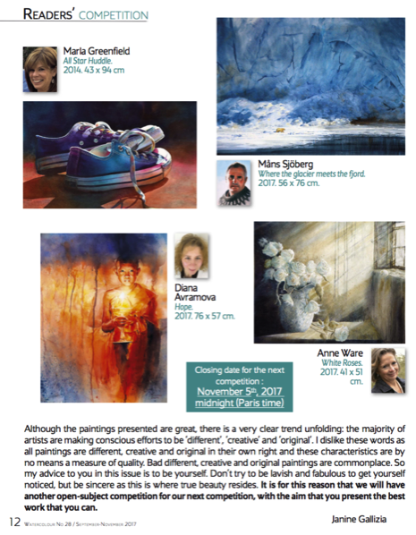 Marla's piece, All Star Huddle, was published in The Art of Watercolour as one of their Readers' Competition winners in the September/November issue.